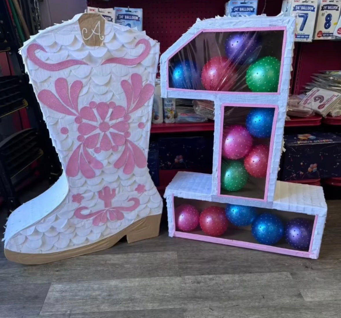 Our Flat White Boot Piñata (custom-made) is designed exactly to our customers vision. This piece includes a personalized design, a #1 decorated in your preferred colors, and added balls.